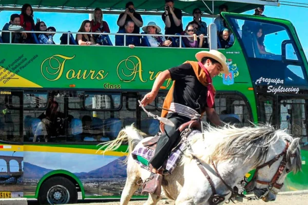 Descubre lo mejor de Arequipa en un recorrido panorámico a bordo de un mirabus de dos pisos. Este city tour te llevará por los lugares más emblemáticos de la Ciudad Blanca, como la Plaza de Armas, el Mirador de Carmen Alto y el tradicional barrio de Yanahuara. A lo largo del recorrido disfrutarás de espectaculares vistas de los volcanes Misti, Chachani y Pichu Pichu, mientras conoces la historia, arquitectura y belleza natural de Arequipa. Ideal para todas las edades, este tour ofrece una experiencia cómoda, cultural y visualmente inolvidable.