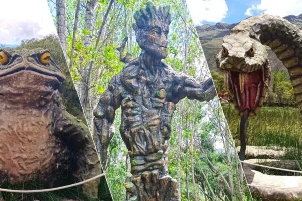 - Ao chegar, mergulharemos no mágico Pantanal de Huasao, um espaço ecológico ideal para observação de pássaros e relaxamento. Você verá esculturas de madeira esculpidas de personagens fantásticos, como Groot, Baby Yoda, Ents e duendes andinos, combinando arte, natureza e tradição.