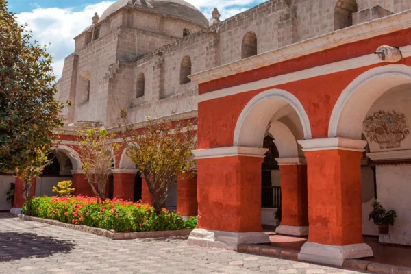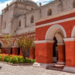 Continuamos hacia los Claustros de la Compañía, donde podrás admirar la arquitectura típica arequipeña construida en sillar, la piedra volcánica blanca que da nombre a la ciudad. Este espacio alberga tiendas artesanales y cafés encantadores.